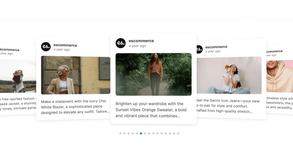 ソーシャルメディアのアップデートを、閲覧者がスワイプしやすい清潔なスライダーウィジェットに変え、エンゲージメントを高めます。ライブのソーシャルフィードをダイナミックなカルーセルウィジェットに変えることで、動き、新鮮さ、個性を加え、ウェブサイトを視覚的に活動的で最新の状態に保ちます。当社のAIカルーセルジェネレーターは、あなたのコンテンツに最適なソーシャルフィードウィジェットを作成し、すべてのUGCが最高の見た目とパフォーマンスを発揮することを保証します!