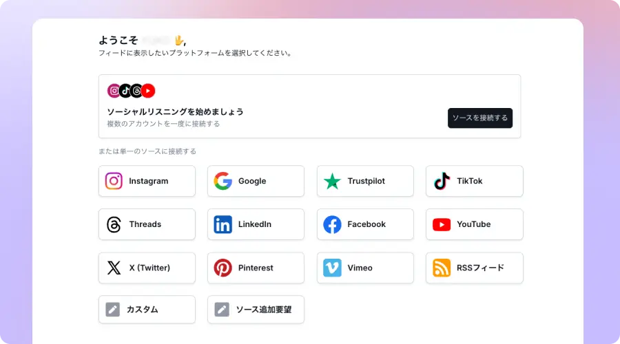 アカウント作成後、「ソース」セクションにアクセスして、ウィジェットに表示したい投稿を集約するために、すべてのソーシャルメディアアカウントを接続します。 主な人気プラットフォームから複数のアカウントを接続できます。