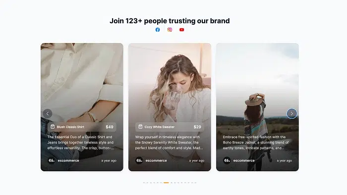 上部には、ブランドへの信頼を示す簡潔な社会的証明(例: “Join 123+ people trusting our brand”)と、各ソーシャルメディアへのリンクを配置。中央には、フルサイズの画像カードが動きのあるスライダーとして表示され、特にEコマースサイトで、インスピレーションから購入への動線を構築するのに最適です。