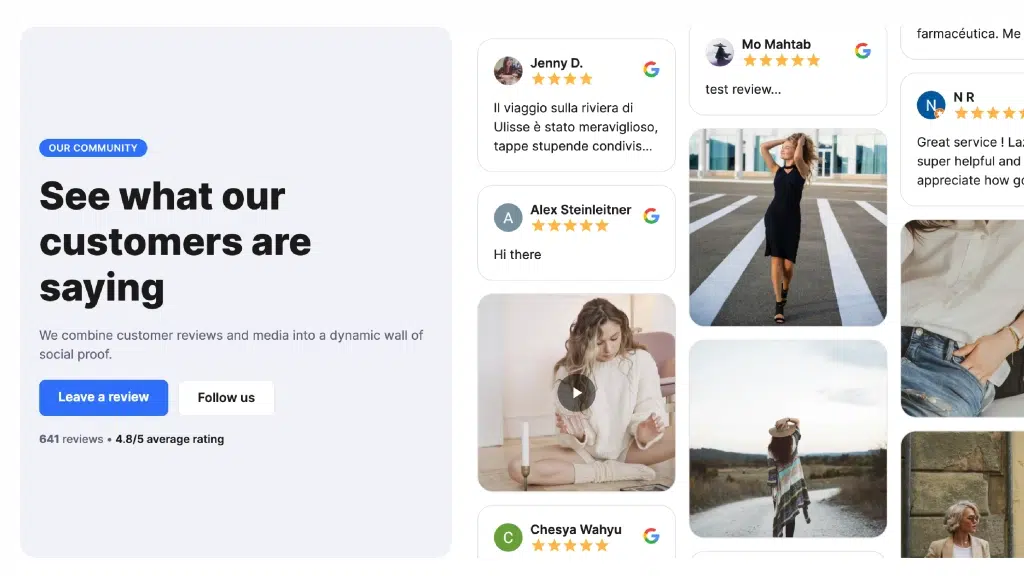 顧客のレビューとメディア(画像/動画)を組み合わせた強力な社会的証明(Social Proof)セクションを、ウェブサイトに構築するために設計されています。