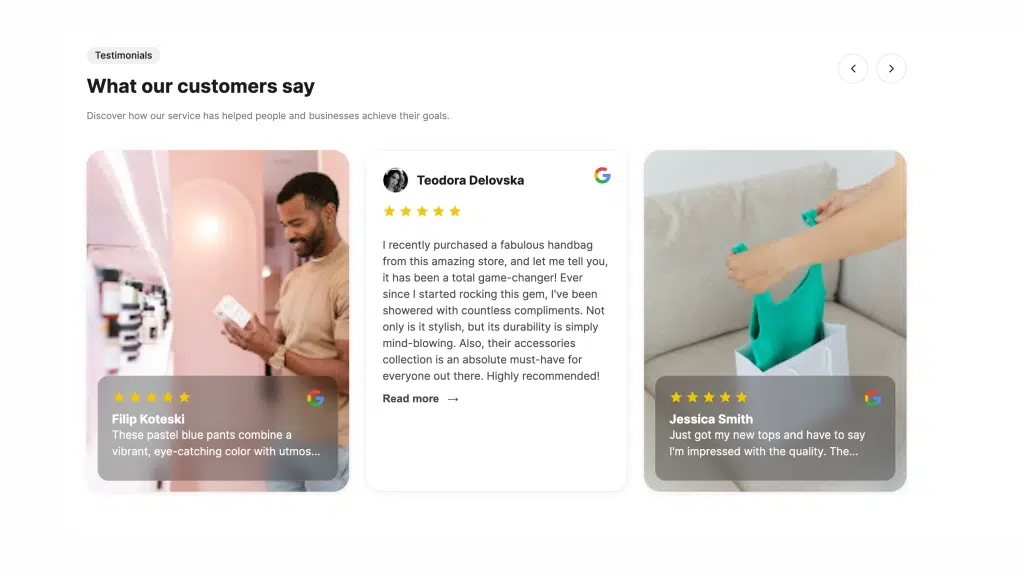 最も強力な顧客レビューをきれいで没入感のあるグリッドに集め、レビューを強力なソーシャルプルーフに変えます。このレビューウォールレイアウトは、本物の顧客ストーリーを強調し、ブランドの信頼を大規模に強化し、訪問者にあなたのビジネスが愛される理由の鮮やかなスナップショットを提供します。