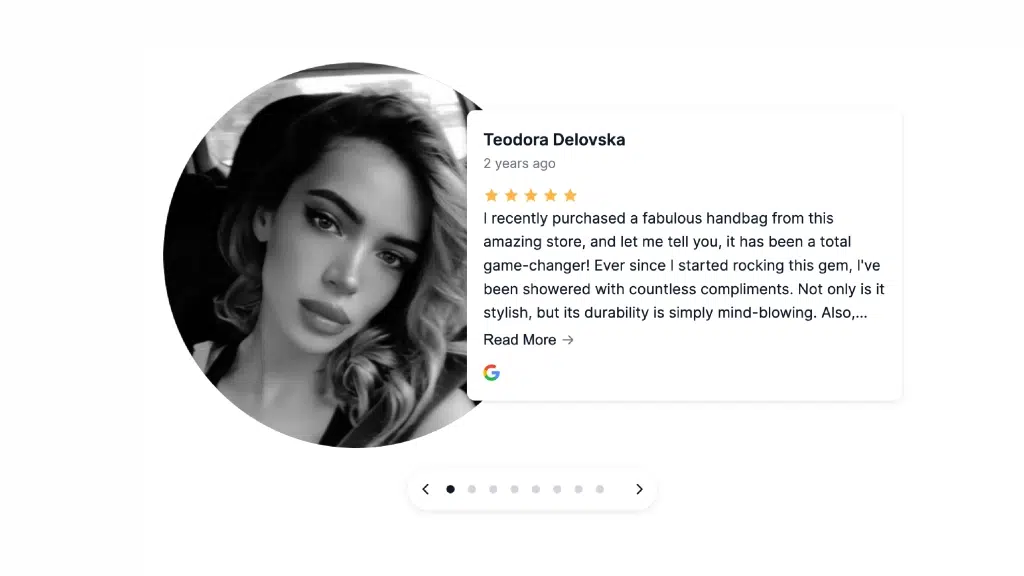 顧客からの写真付きレビューや使用例(UGC)を、ウェブサイト上で際立たせるために設計された、モダンで高品質なレビューウィジェットです。このテンプレートは、テキストレビューだけでなく、顧客の視覚的な体験を前面に押し出すことで、製品の信頼性、魅力、実際の使用イメージを強力に伝えます。Googleレビューとの連携を保持しつつ、左右の矢印でスライドできる形式で、多くの肯定的なフィードバックを効果的に展示できます。