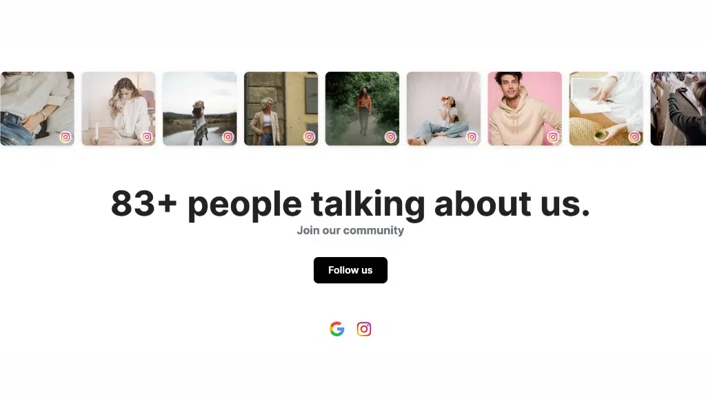 ウェブサイトの訪問者をブランドのソーシャルメディアコミュニティへ強力に誘導することに特化した、ミニマルかつインパクトのあるセクションを構築します。複数の顧客投稿写真(アバターの役割)を上部に配置し、「83+ people talking about us.」という具体的な数字で社会的証明をアピールします。中央の目立つ「Follow us」CTAボタンと、下部のソーシャルアイコン(Google、Instagram)により、フォロワー増加を促進します。投稿が動画の場合は自動再生させながらスライドすることができます。