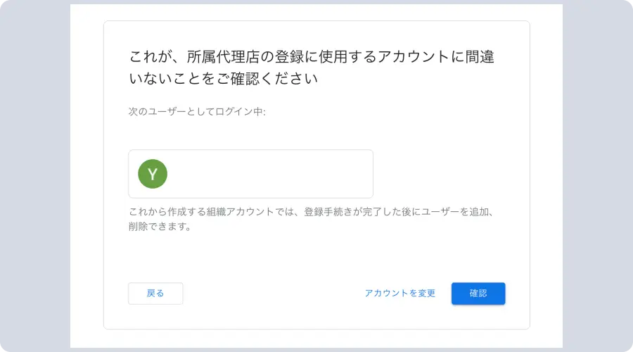 次に、GBPの拠点と関連付けられていない、代理店のGoogleアカウントでログインするよう求められます。