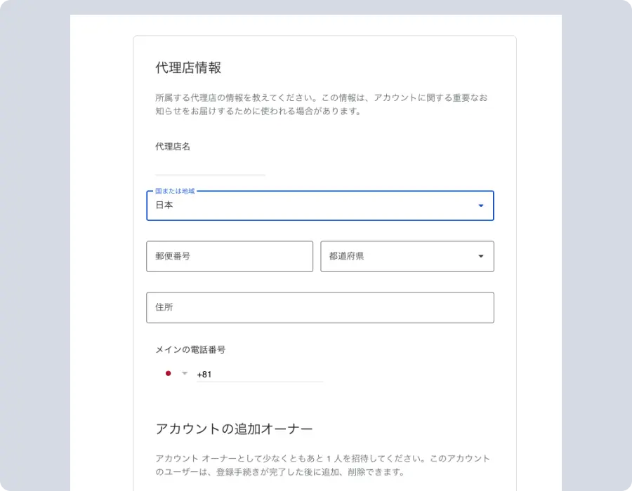 アカウントを作成するか、メールアドレスを確認すると、新しい代理店に関する詳細情報(名前、所在地、連絡先など)の提供を求められます。