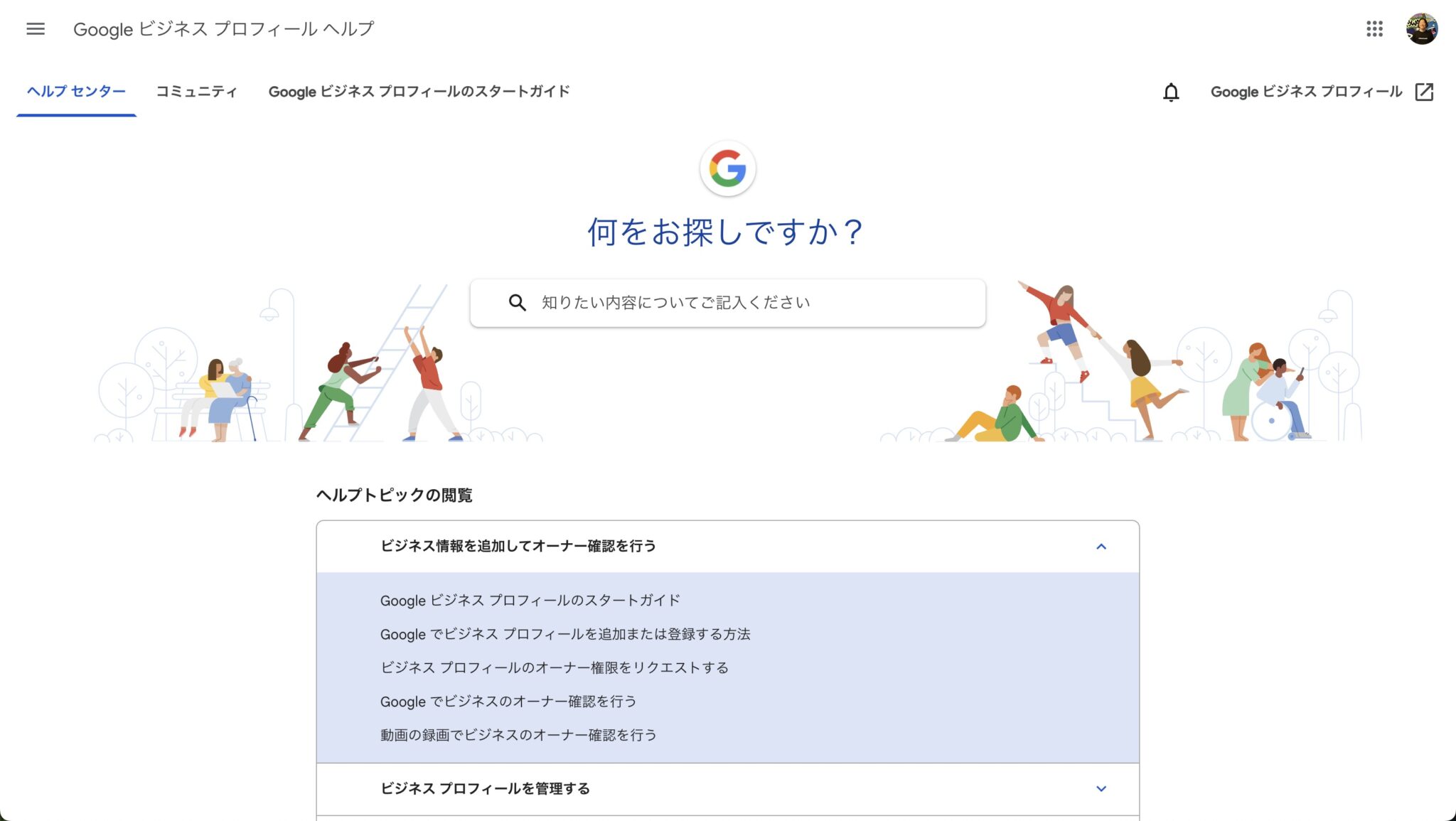 Googleサポートへの問い合わせは、Googleビジネスプロフィールのヘルプセンターを経由して行います。画面を下にスクロールすると「さらにサポートが必要な場合」「お問い合わせ」の項目が表示されるため、こちらをクリックします。