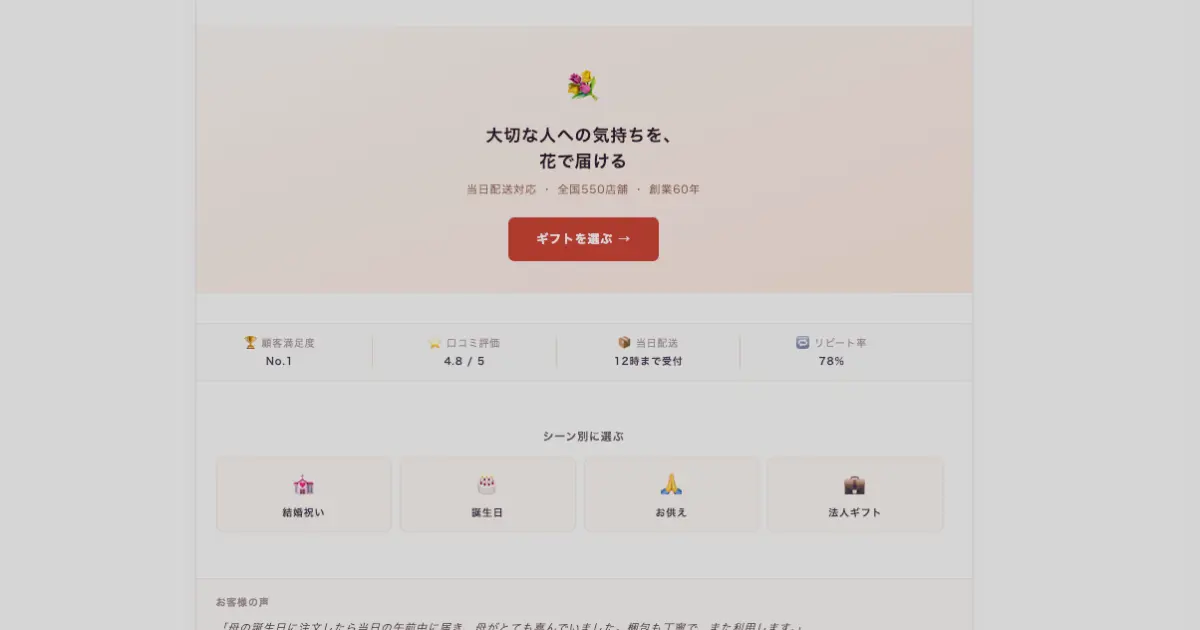美容室・フラワーショップ・クリニックなどサービス業のLPは、感情的なビジュアルと明確なカテゴリ分けで「自分の求めているものがここにある」と感じさせることが重要です。信頼バッジや口コミを早い段階で見せることで、初めての利用者の不安を取り除きます。