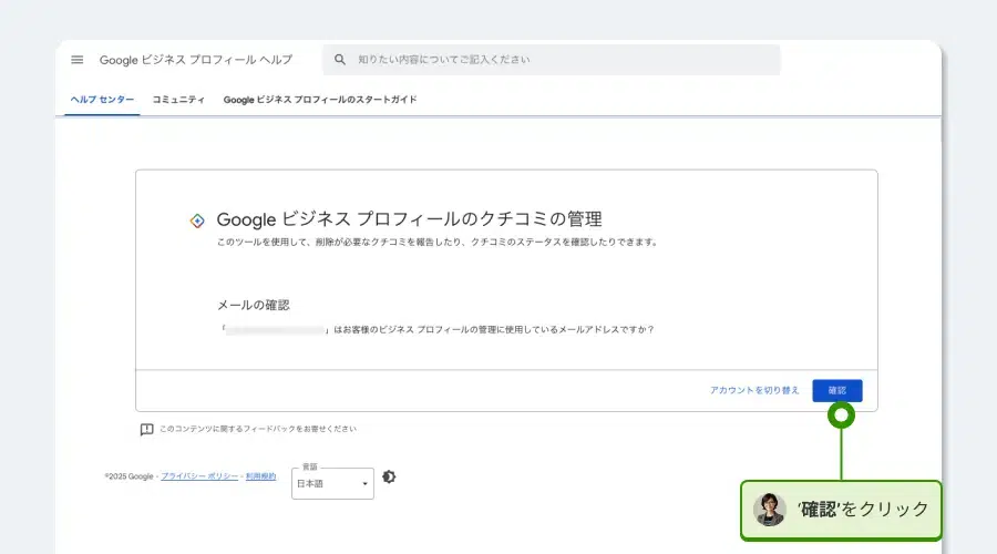 口コミの削除依頼をするには、皆さんがGoogleビジネスプロフィールのオーナーである確認を済ませている必要があります。まだ登録をしていない場合やオーナーかくにんがまだの場合は、Googleビジネスプロフィールの公式サイトから手続きをして下さい。
