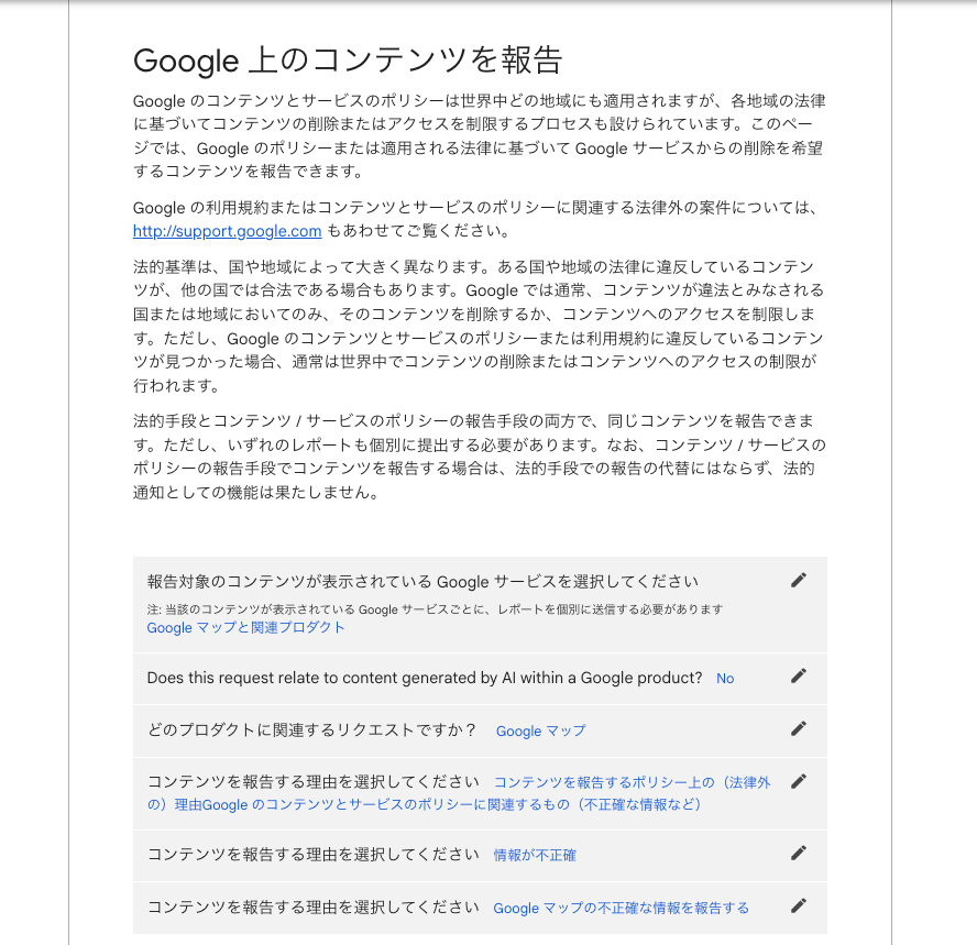 コンテンツ問題にさらに厳正に対処したい場合は、Legalヘルプ法的な口コミ削除リクエストを提出するオプションもあります。ただし、Googleは限られた状況下でのみこのリクエストを検討します。このプロセスを完了する手順は非常に簡単です。