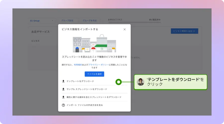 グループが作成されると、お店やサービスの追加ページに進みますので、一括登録に必要なすべての店舗情報をExcelやCSV形式のスプレッドシートにまとめます。