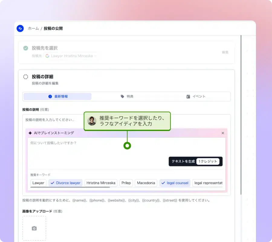これを解決するため、外部ツールにはAI 搭載のコンテンツ作成サポートが必要です。具体的には、キャプションのブレインストーミングや MEOキーワードの提案、そしてコンテンツの自動計画作成機能です。これにより、クリエイティブな作業を効率化し、MEOに必須である継続的な投稿の負担を大幅に軽減できます。