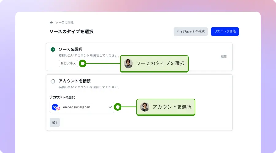 プラットフォームを追加した後、EmbedSocialにInstagramアカウントを接続します。ソースのタイプとアカウントを選択後「完了」、そして右上の「ウィジェットの作成」をクリックします。