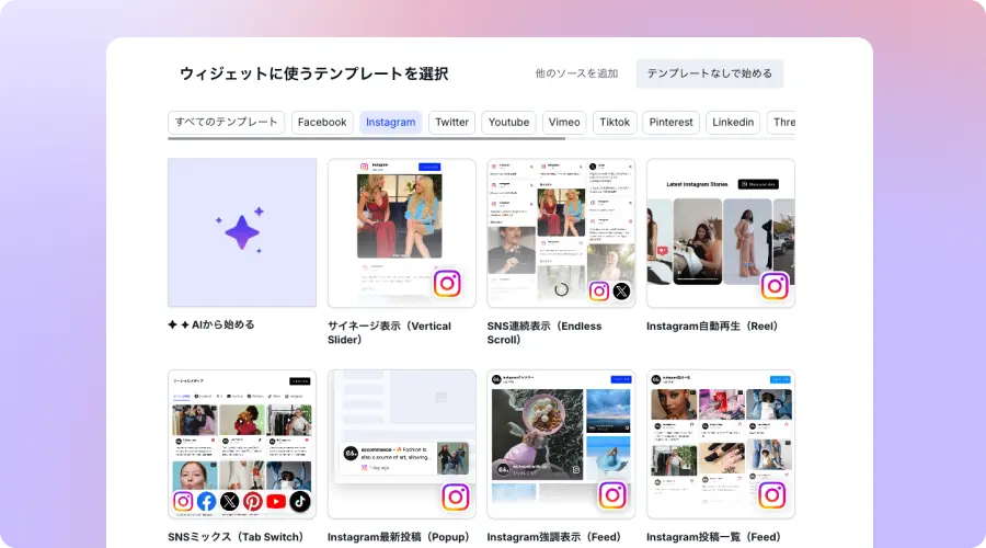 Facebook、Twitter、Instagram、TikTok、LinkedIn、Pinterest、YouTubeなどのソース別、またはグリッド、スライダー、ポップアップ、コラージュなどのウィジェットレイアウト別に閲覧できます。