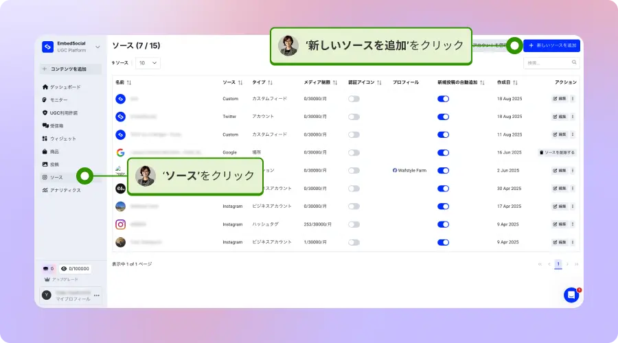 まず、EmbedSocialにログインし(アカウント作成)、「ソース」に移動し、「新しいソースを追加」をクリックします。