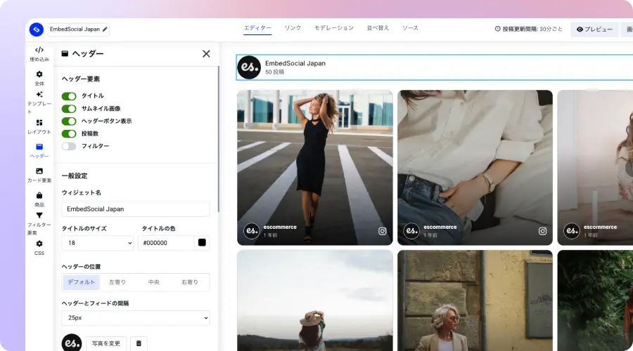 SNSフィードは、グリッド、カルーセル、スライダー、コラージュなど、さまざまなレイアウトで提供されており、CSSエディターを使用したり、他のカスタマイズオプションを適用したりすることで、あらゆるウェブサイトのデザインにフィットさせることができます。