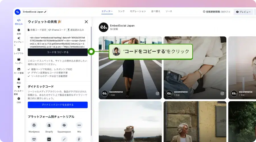 SNSウィジェットを埋め込む準備ができたら、「埋め込み」をクリックし、「コードをコピーする」をタップします。